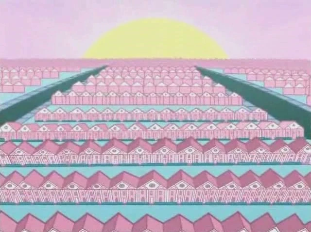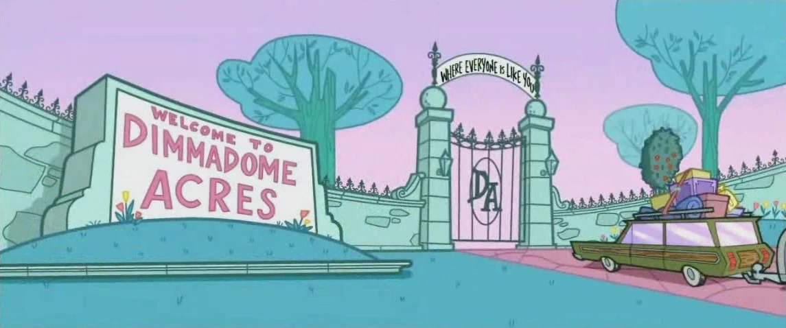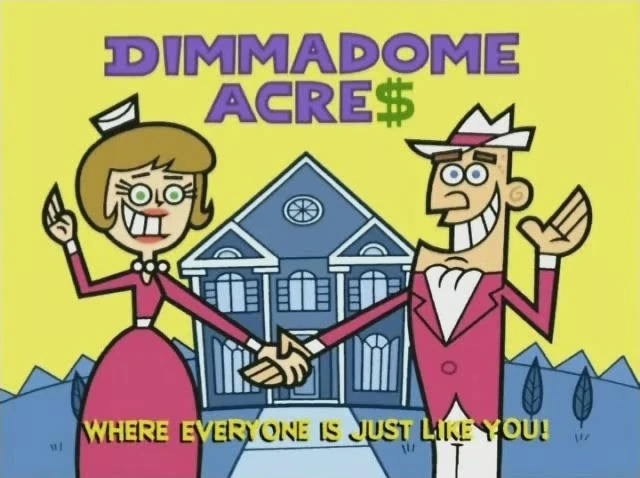 This planned community is where most people in Dimmsdale moved to after Mrs. Turner sold their houses. All of the citizens drink Dimmadome Farms Milk, except for Timmy (who busy drinking mega fizzy juice to practice for a burping contest), which has some ingredient that causes the drinker to enter a trance-like state, and they try to get other citizens to drink it as well. After Timmy threw his Fizzy Juice into the endless supply of milk, everyone was free from their trance, Dimmadome Acres was turned back into a garden field, and Doug Dimmadome lost all his memories prior to Dimmadome Acres. Afterward, Mrs. Turner sells everyone back their old houses since this place was no longer Dimmadome Acres and nobody had anywhere to live as a result.