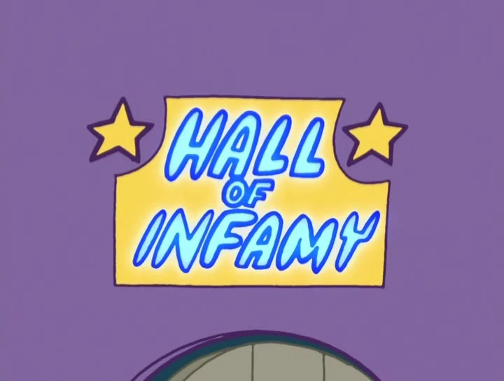 Alluding to its gloomy nature and in contrast to its positive counterpart, the Hall of Infamy is utterly smudged (mostly with spider webs) and its sign has dim letters (what led Timmy to mistake it for the Hall of Fame by not seeing the letters "I", "N" and "Y" in the word "Infamy")