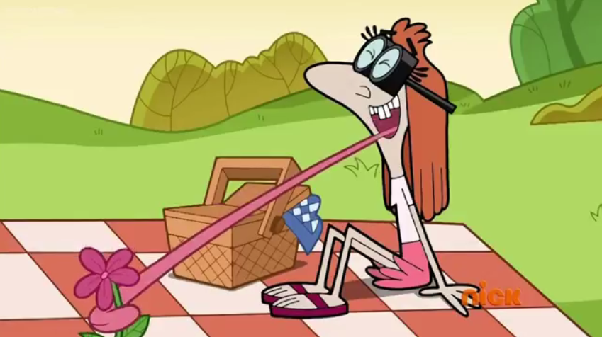 Hummanuh is a lanky adult woman with a similar pale greyish skin tone to Mr. Crocker. Most of her face is taken up by her very large nose. She has buck teeth in the front while the rest are crooked, also similar to Mr. Crocker. Her hair is long and red with bangs that flip over the top of her very thick glasses she needs to see—because of her poor vision, she is almost always seen with her eyes closed. Hummanuh wears a white t-shirt, pink skirt and dark pink sandals.