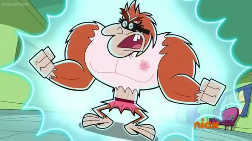 After being dumped by Mr. Crocker, Hummanuh morphs into a giant gorilla monster. In this form, she is extremely muscular and hairy, her new big feet tearing her sandals off and her buff arms ripping through the sleeves of her shirt.