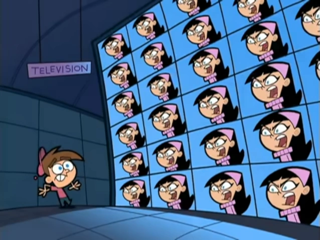 While Timmy is running through the department store trying to escape Trixie, Wanda appears before him and gloats and dances around, telling him "I told you so! I told you so! Go Wanda! Go Wanda!", Timmy realizes that Trixie is used to having hundreds of boys complimenting her every day, and with all of them gone she expects Timmy to adore her the same amount as hundreds of boys. Timmy wants to get out of this relationship, so he asks Wanda to unwish the wish, but before she can, Cosmo suddenly appears. He is jealous of Timmy and thinks he is trying to steal Wanda from him, so he grabs her and they poof away. Timmy is alone, but not for long. He tries to hide in a stack of tires but Trixie was waiting right under there for him! She grabs him by the arm and drags him away, Timmy tries to gnaw his arm off but Trixie sees this and asks him why. Timmy realizes he needs to do it the hard way, and although he never thought he would do this, he breaks up with Trixie. This makes her furious, she says that if she cannot have Timmy then nobody can and, as a result, vows to kill him. Wanda attempts to poof back to Timmy so they can make a quick wish, but Cosmo jealously poofs them both away from Timmy. She chases Timmy throughout the department store, attacking him with gardening tools, a lawn mower, a baseball launcher, and even a helicopter. While Timmy ponders what they don't sell in this store, Trixie locks and says, "Even though it's technologically impossible for me to miss you, I'll MISS YOU!" and presses the fire button.