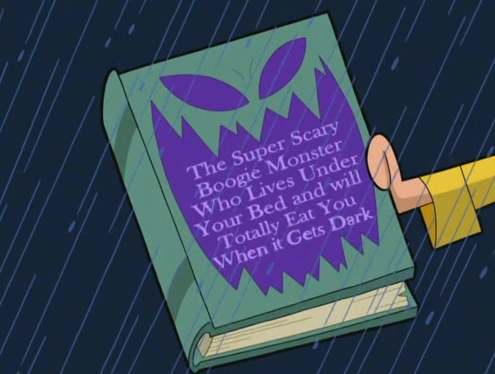 - The Super Scary Boogie Monster Who Lives Under Your Bed and will Totally Eat You When it Gets Dark is a book in the episode Lights Out. It is about a purple boogie monster who bared its fangs at a little kid and totally ate him.