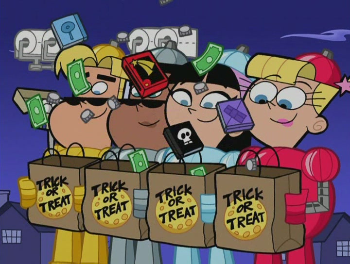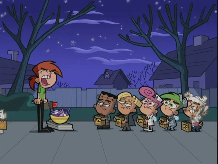 Timmy is watching the "Crash Nebula Halloween Special" on television. In the show, Crash Nebula narrowly escapes an evil pumpkin shaped robot called the Pumpkinator, as it destroys the pumpkin-shaped planet they were fighting on. Although Crash Nebula escapes with his life, he screams in frustration as the Jack-O-Bots, four robots that come together to form the Pumpkinator, escape and fly off through space. Timmy points to the television as it shows the Jack-o-bots, telling his godparents that is what he wants to be for Halloween. Cosmo takes this literally and turns Timmy into his television that he was pointing at. Meanwhile, Mr. and Mrs. Turner have decided to go as each other for Halloween, so Mr. Turner has his wife's voice and vice versa. Wanda explains to Timmy that only four Jack-o-bot costumes were made, and they were all won in a contest. As Timmy asks who, the doorbell rings and the first trick-or-treaters of the night appear at Timmy's doorstep. The visitors are Tad, Chad, Trixie Tang, and Veronica, the popular kids, who were dressed in the Jack-O-Bot costumes Timmy wanted, having won them unfairly by bribing the judges. Chad presses a button on his suit, which causes an egg and toilet paper launcher to appear from his Jack-o-bot suit. Not wanting to be tricked, Timmy's parents hand the popular kids all of Timmy's stuff, his video games, his CD's, and his birthday present money. As the popular kids walk off, Timmy asks his parents why they gave all his stuff away, and they answer that it was because the costumes were so good. Chester and A.J. show up, but their costumes are not as good, so they just get papers with useless advice written on them instead. Chester and A.J. complain to Timmy about the "treats", who responds that they are not going to get any treats in their lame costumes. Offended, they ask Timmy what he is going as, and he jokes "the scariest monster of them all... Vicky!" He laughs, unaware that Vicky is standing right there. She has been hired to watch Timmy and his friends while they go around the neighborhood, trick or treating. Vicky grabs a roll of toilet paper and wraps Timmy in it, giving him a really makeshift mummy costume. Chester and A.J. briefly laugh at Timmy's lamer costume, until Vicky explains that she is getting a 70/30 split of all the candy and tells them to get moving. Chester and A.J. dash off, dragging Timmy behind them.