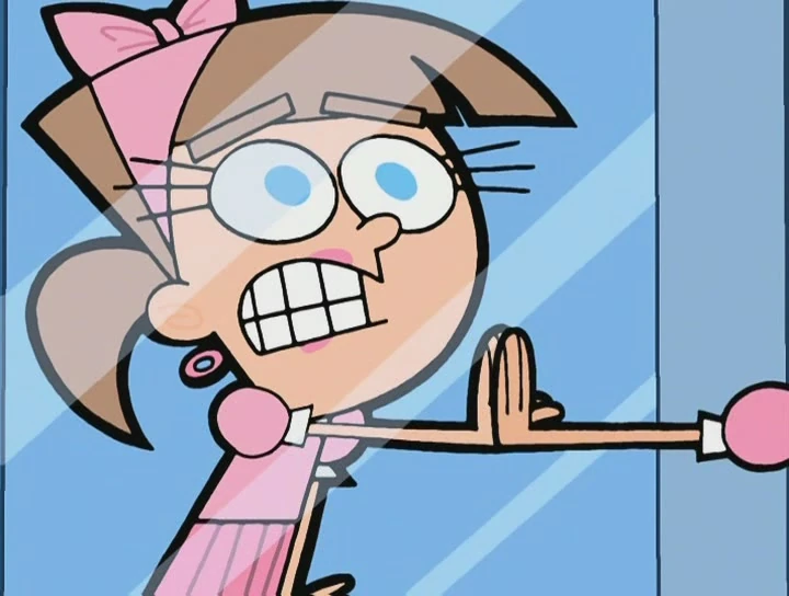 Timantha tries to think, a thought cloud comes behind her revealing girlish stuff like Unicorns, ballerinas, rainbows, bunnies and the color pink. A sudden realization dons on her, and Timantha says, "Hey, now that I think like a girl, I can totally use my girl brain to think up the perfect gift for Trixie." Cosmo agrees sarcastically saying, "Wow, that's a great idea little girly girly!" twirling while doing so. Wanda opens the door for Timantha and says, "Can I get the door for you Ma'am?" and at this Cosmo and Wanda laugh. Timantha, with a glare, says, "No, I'm going to the mall to find something Trixie would like, but just so you two can have a laugh at while I'm gone, I wish you were a woman and you were a man," saying it to Cosmo and Wanda respectively. They protest "What?", but Timantha reminds them that as her fairy godparents they must grant the wish, so each fairy reluctantly turns each other into the other gender being cloaked in a cloud with the male and female signs. Timantha congrats them and says "Congratulations you are now Cosma and Wando." Cosma responds, saying, "Oh my gosh, how do I suddenly know which boy bands rock out loud?" and Wando says, "I don't know why am I tempted to scratch myself and not care who sees?" Timantha says goodbye to her gender-swapped godparents and leaves. The camera quickly changes to the mall. Timantha appears walking in a ballerina walk. She starts to say to herself "think like a girl" saying it over twice. She then notices a comic store asking herself, "Do I still like comics?" She then thinks it is okay because it included "muscular guys in spandex fighting crime" with a quick "cool" she heads over to it. As Chester and A.J. watch from a distance, Chester is questioning why "a girl" is entering a comic shop. A.J. is eluded as well, but decides she is so cute he will stare at her until she is so uncomfortable she has to talk to him. He falls lovestruck as Chester screams as if A.J. is dying and the scene shifts back to Timantha.