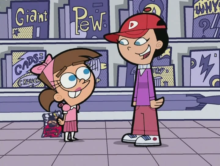 In the store, Timantha finds the last copy of Skull Squisher and reaches for it, but another kid grips it as well. The two fight, with Timantha winning, but in the process the other kid's hat falls off, revealing her to be Trixie, much to the other kid's shock. The popular girl begs Timantha to keep her visit to the comic shop quiet, out of fear everyone will think that she's weird. Trixie declares her, her new best friend before ripping up a picture of Veronica (causing the real Veronica, elsewhere in the mall, to scream in pain). The popular girl then asks her new friend's name, to which she responds with a weak Timantha. As Trixie leaves, she tells her new best friend to meet her at the salon later to hang. As Timantha leaves, she runs into Chester and A.J., A.J. offers her a dead frog, to which Chester panics and tackles him. The frog flies out of A.J.'s hands and splats at Timantha, drenching her with some water. Timantha notes even as a girl that is still gross. Back at the house, Wando becomes impatient since they were supposed to meet Timmy an hour ago. While he sits watching television and eating a hot dog, Cosma obsesses over what to wear. Wando tells her to just pick something. Cosma goes into the bathroom, only for a splash and her yelling, "Would it kill you to leave the lid down?" Wando only gives a snarly comment in return. She then drinks some soda before burping. At the mall salon, Timantha and Trixie are enjoying a spa date. Timantha says "This feels great!" Trixie agrees, saying, "It's like their scrubbing all your troubles away." They are having shampoo in their hair which quickly changes into having their nails done Timantha says "and they're showing my favorite soap opera, this place rules" while a TV shows the title Kissy Kissy Goo Goo. Trixie admits that if she met a boy who admitted he liked Kissy Kissy Goo Goo, she would go out with him even if he wore a pink hat. Timantha says, "Really? But he would never come in here." Trixie responds saying, "Well they should, if boys did more girl stuff then girls could do more boy stuff," reading a book labelled PONIES revealing it to be Timantha's Skull Squisher. Realizing Trixie is right, Timantha pulls her out of the salon and into an arcade, which shocks the boys there. A.J. tries once again to hit on Timantha by offering her a dead frog. Timantha finds that "gross" but Trixie finds it to be "cool". Chester panics and pulls A.J. with him into the bathroom. He then nails up the bathroom door to prevent the girls from getting in. He then explains the difference between boys and girls to A.J. and then states that is why both genders have different bathrooms. Chester is then interrupted when Veronica walks out of one of the bathroom stalls, sees the boys, and asks if she's in the wrong room. Chester screams that nothing makes sense anymore and begins tearing the boards off the door. A.J. then offers Veronica a dead frog. As Trixie leaves, she tells Timantha that she's given her what she's always wanted, a friend that would understand her. She then remarks "If you were a boy, I would totally date you," before driving off in her limo, saying that she'll see her at the party. That night, outside Trixie's mansion, Timantha wishes herself back into a boy before entering (and interpreting Cosma's request to wish her and Wando back to normal as "blah blah blah". AJ and Chester give her their gifts (firewood). She then asks her bodyguard if Timantha has made it, which she hasn't. Timmy then enters, giving Trixie a walkman. At first she hears him talking blah, blah, blah until she uses the Girl-To-Geek Translator. Now hearing him clearly, Trixie hears Timmy admit he likes girl things. She finds Timmy's confession so sweet, but under the pressure of being judged, she remarks that's why she has girl friends and throws him out, but not before getting his name right while giving him a friendly good bye. Outside the mansion, Timmy is satisfied that Trixie remembers his name, and realized it happened because he saw Trixie as a person with varied interests rather than just a girl. He wishes Cosma and Wando back to the way they were born, and they revert to normal...with Cosmo getting a long, ugly nose that he was born with. They then try to figure out what to do now since Timmy's parents are not expecting him home yet. They end up back at the salon, where every woman there wants Timmy to date her daughter due to his sensitivity. The Kissy Kissy Goo Goo show then states on television that Roderick fell down an elevator shaft (in reality he quitted the show). Timmy then asks the customers who wants to watch wrestling, and all of them want to watch it. Timmy then changes the channel which shows Roderick having his evil twin Roderick in a toe hold. Timmy and the customers all say, "Roderick, no!" as the episode ends.